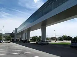 The station includes a four-level, 3,500-space garage with facilities for airport car rental companies and park and ride commuters. The station is connected to the airport via an elevated 1,250-foot (380-meter) skywalk with moving sidewalks, known as the Interlink.[16] Costs included:[17]