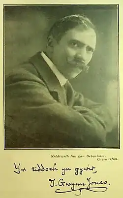 Professor Thomas Gwynn Jones C.B.E. (10 October 1871 – 7 March 1949), more widely known as T. Gwynn Jones, was a leading Welsh poet, scholar, literary critic, novelist, translator, and journalist who did important work in Welsh literature, Welsh education, and the study of Welsh folk tales in the first half of the twentieth century.[1] He was also an accomplished translator into Welsh of works from English, German, Greek, and Irish.
