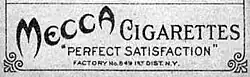 The name Mecca chosen for the cigarette brand was related to an increasing demand for Turkish tobacco at the beginning of the 20th century, so Arabic names helped increase sales (Hassan or Fatima were other brands used by the company by then).[1]