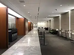 The banking pavilion is a double-height structure housing the main branch of the bank. It contains fifteen 22.9 m2 (246 sq ft) modules within a single interior space,[24] with smaller areas inside the pavilion cordoned off using counters and cabinets, all built with the typical rich materials of Mies's palette—marble, English oak, and granite.[9] The roof of the building is made of deep steel I-sections, each beam supported on only one steel I-section column at each end, all combined to create a waffle-grid ceiling resting on a row of corresponding, equally spaced columns around the periphery. This structure was both a further development on the post office pavilion of the Federal Center in Chicago—which has fewer expressed columns and a second level balcony—and a precursor to the Neue Nationalgalerie completed in Berlin in 1968—which had a similar roof supported on only eight large steel columns. The TD Centre pavilion was described by The Globe and Mail as "among the best spaces Mies ever made".[26]