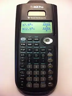 The TI-36X Pro is an updated version of the European model, the TI-30X Pro MultiView, which was taken off the market shortly after its release in 2010 because of programming errors.[1][2][3] While the 30X's bugs were fixed for relaunch as the 36X Pro, the updated version contains a notable software bug of its own, where it displays mixed numbers involving π incorrectly.[4] In such cases, the display shows π in the numerator of the fraction, instead of as a separate coefficient.
