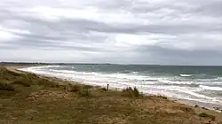At around 1 a.m., the vessel passed near a rocky shoal surrounding the Le Roheu turret. According to the subsequent investigation report, it is likely that the very serious damage to the hull observed after the grounding (tearing of the bottom, deformation of the vertical sides) was inflicted at this point: the ship, subjected to vertical movements due to waves or swell, would have slammed (hit the bottom of the hull in a vertical downward movement) on rocks located five meters (16 ft) meters below the level of the lowest seas.[19] At 1:13 a.m., the ship's captain repeated his towing request, stating that he was unable to take a more southerly route away from the danger. The CROSS informed him that the tug would not be in the area for some time. The tug Abeille Bourbon, which patrols the area around Ushant Island, was alerted via the Préfecture Maritime de l'Atlantique. The tug headed for Lorient at 1:29 a.m. but was unable to reach the scene until late morning.[18] At 1:22 a.m., the CROSS asked the captain to anchor, as the vessel was now only two miles from the coast and heading towards danger. At 1:30 a.m. the vessel spun its two anchor lines in seven meters (23 ft) of water, but the anchor failed and the ship drifted towards the coast at a speed of 1.5 knots (2.8 km/h; 1.7 mph). At 1:37 a.m., CROSS informed the ship's captain that, given the bad weather, the Lorient tugboat could not intervene, and that in the meantime he would have to do "as best he could." At 1:45 a.m., the captain activated the distress signal and assembled the crew in the wheelhouse, and at 1:52 a.m. indicated that the crew was preparing to abandon ship. CROSS Étel informed the captain at 1:56 a.m. that a helicopter tasked with evacuating the crew was due to arrive in the area an hour later. At 2:01 a.m., the TK Bremen ran aground on the sandy beach of Kerminihy[20] in the commune of Erdeven.[21] The onboard anemometer indicated a Beaufort force 12 wind.[20]