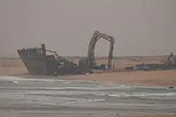 The contract to dismantle the wreck was awarded to a Dutch company, and the beach was closed to the public from December 23 for the duration of the work.[60] This company had already worked on dismantling the Rokia Delmas, which ran aground in Charente-Maritime in 2006, and work began on December 26.[61] The plan was to cut up the wreck using a giant crane, then remove the 2,000 tonnes (2,000 long tons; 2,200 short tons) of metal in three weeks, before restoring the site to its original state in two and a half months.[62] The dismantling of the interior fittings was awarded to a Brest-based company, which arrived on site on December 23,[63] while the water decontamination work was entrusted to a Saint-Malo-based company.[64]