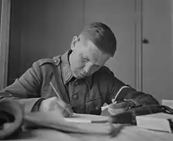 In wartime Finland, TK companies (the abbreviation TK comes from the Finnish word tiedotuskomppania, 'information company') were units under the information division of the Finnish army founded before the Winter War, which were active during the Continuation War and the Lapland War. Soldiers working in the companies were called TK men (Finnish: TK-miehet), whose civilian professions usually were journalists, teachers or advertisers.[2] Some of the men were notable authors, illustrators and radio reporters. They acted as war correspondents, war reporters, cinematographers, photographers, illustrators, guides, announcers and announcement designers.[3]