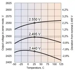 - Temperature. Thermal plot of a bandgap reference voltage has a hump-like shape. By design, the hump is centered on +25 °C (77 °F), where VREF=2.495 V; above and below +25 °C (77 °F), VREF gently decreases by a few millivolts. However, if a specific IC deviates substantially from the norm, the hump shifts to lower or higher temperatures; in the worst outliers it degenerates into a monotonously rising or falling curve.[15] [12]