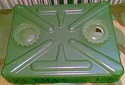 The TMA-2 is a rectangular plastic cased Yugoslavian minimum metal anti-tank blast mine. It is very similar in appearance and size to the PT-56, which it replaced. The mine consists of two sections, an upper ribbed pressure plate with two large circular fuze caps, and a lower base section containing the main charge and two primary fuze wells containing UANU-1 fuzes. A secondary fuze well is provided in the base of the mine for an anti-handling device.