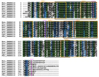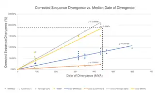 TMEM212 in Homo sapiens is highly conserved. It is found in vertebrates but not invertebrates and has many orthologs including mammals, birds, reptiles, amphibians and fish.[7][33][8] Table 2 below shows orthologs of TMEM212 in mammals, reptiles, birds, amphibians and fish. As displayed in the multiple sequence alignment to the right, strict orthologs such as mammals and reptiles have highly conserved regions. Most of the conserved areas fell where transmembrane regions are localized. TMEM212 is evolving moderately quickly compared to reference sequences Cytochrome C and Fibrinogen alpha. This is shown to the right when comparing the divergence rates of TMEM212, MS4A7, Cytochrome C, and Fibrinogen Alpha.