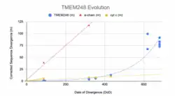 Homologs of the TMEM248 gene are found in vertebrates and invertebrates. The most distant orthologs of TMEM248 are in echinoderms, mollusks, and arthropods, which diverged approximately 680 million years ago.[22] Orthologs of TMEM248 are not found in annelids, nematodes, cnidarians, sponges, fungi, plants, or bacteria.