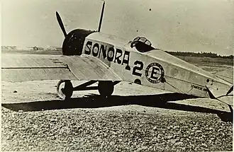 The first aircraft of the Serie E family was a low-wing monoplane with registration number 2-E-98, which was dubbed "Sonora", this airplane made its first flight on March 2, 1922. It was powered by an 82 kW (110 hp) le Rhône 9J 9-cylinder rotary engine, exceeding expectations, with performance significantly higher than similar aircraft at the time. Despite its benefits, the plane was not produced in series, because for was the Technical Consultant of the Aviation Department Ralph O'Neill, the aircraft could not be used for military purposes.[1] The "Sonora" was in service with the Mexican Air Force until 1925 and later dismantled, being sold to a private individual.[2]
