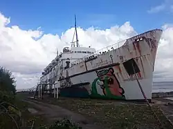 The plan was to transform the ship into the largest open air art gallery in the UK. As of August 2012, the Latvian graffiti artist "KIWIE" was commissioned to spraypaint a design on the ship.[13] The ship was covered with graffiti described as "bright and surreal".[14] The first phase of the project saw Kiwie and other European graffiti artists paint murals on the ship between August and November 2012, and the second phase (starting at the end of March 2013) included the work of British-based artists such as Snub23, Spacehop, Dan Kitchener and Dale Grimshaw.[15] One of the artworks is a picture of the ship's first captain, John 'Jack' Irwin. However in 2017 both sides of the ship were painted black.[16]