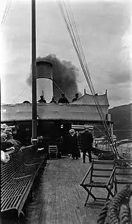 The machinery was amidships down in the hull, with a lower deck fore and aft, the crew's quarters being located towards the bow.[18] A full-length main deck was above, enclosed almost to the stern, with circular portholes over much of the length and larger rectangular windows aft.[19] First-class accommodations were aft, and second-class fore, with dining saloons for each class on the lower deck.[18] The superstructure or promenade deck was open, save for a pilothouse and bridge, a house around the uptakes, and a small house just aft of amidships.[19] The promenade deck planking showed provision for conversion to paddle propulsion, in case the turbines proved a failure.[14] Uniquely at that time, a short flying deck supported the two funnels, and a lifeboat on each side of the funnels.[20]