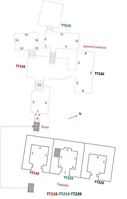 From the courtyard in front, a well leads to the underground funerary apartment which still has a common part (numbering in red on the plan) with a first antechamber which leads to a second antechamber which allows access to the three funerary chambers connected to the tombs TT218 (numbering in red), TT219 (numbering in blue) and TT220 (numbering in black). In the flight of stairs which gives access to the first antechamber (4 red) remains of the boat of Ra worshipped by the deceased (Amennakht) depicted kneeling on both sides with two Anubis/jackals; on two registers (5 red) the boat of Ra with Hathor and some baboons in adoration; relatives dragging the sarcophagus followed by priests of Ra; (6 red) the deceased with a hymn to Ra. In the first antechamber, (7 red) the deceased crouched under a palm tree drinks from a pond while his wife is adoring the gods shown in the scene on the adjacent wall (9) Thoth, Geb, Horus, Nut, Shu, Khepri and the deceased kneeling with his family with a hymn to Ra; not far away, the wife crouched under a palm tree drinks from a pond while the daughter (whose name is not indicated) is in adoration of the deities of the following scene (8 red) Ptah, Thoth, Selkis, Neith, Nut, Nephtys and Isis; the deceased and his wife are also represented, kneeling, with two children and a hymn to Ra. On the architrave of the staircase leading to the second antechamber (10 red), Osiris seated with the personification of a Djed pillar in front of the hills, a falcon and Nut who is embracing the solar disk; on the sides the deceased with his son Khaemteri (TT220) kneeling, and the deceased with his son Nebmaat (TT219), all in adoration of Ra.