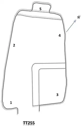 The tomb is small, consisting of only one chamber with a stele niche and burial shaft, but it is well decorated.[1] It is one of two tombs in Dra' Abu el-Naga' that is open to the public.[2] The tomb is reached via a single ornamented chamber measuring only 4 by 1.85 metres that is carved out of the rock and has a funerary stela in a niche at the far end.[3] The real burial chamber is reached via a funeral tomb-shaft that extends into the deep (to the right of the entryway). The tomb faces south-east and its corners are rounded and none of the walls are flat.[4] The wall immediately to the left-hand side of the entrance is divided into four registers. Roy and his wife are seen before a man who is bringing a calf, and there are scenes of ploughing and pulling flax.[2] Around the tops of the walls a frieze of Hathor heads, Anubis jackals and the titles of Roy and his wife can be seen.[2] The ceiling of Roy's T255 tomb is painted in bright bold colours which remain vivid despite the passage of 3,200 years.