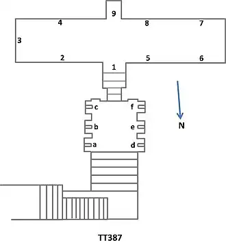 The Theban Tomb TT387 is located in El-Assasif, part of the Theban Necropolis, on the west bank of the Nile, opposite to Luxor. It is the burial place of Meryptah, the royal scribe of the table of the Lord of the Two Lands,[1] and the Governor of the Desert Lands for the Southern Deserts. His wife is a Lady of the House and a Chantress of Amun. Her name is Nebkhentu.[2]