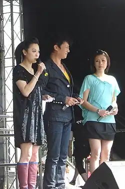 Former TVBS-Europe presenters, (from left to right) Cecilia Chiu, Simon Li and Katie Chan at an TVB event in 2008.