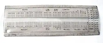 As a maintenance aid, the exchange was equipped with a Maintenance Data Recorder (MDR). This had a rather primitive printer, which displayed the identities of equipment in use at the time that the exchange had detected a call failure. For example, in the event of a successful repeat attempt to provide dial-tone, the MDR would print. If the repeat attempt failed, then the MDR would print twice in quick succession, giving details of the equipment in use on both the failed paths. The prints were not easy to read. All that emerged were short burn marks on the special paper in up to 45 different places in each of two rows. It was necessary to hold a plastic graticule (see picture below right, under that of an MDR) over the paper to find out what the presence of each burn mark indicated. If more than eight call failures were detected in less than 8 minutes, then the critical common control units would be forced to change from the side in service (A or B) to the other side, the automatic 8-minute changeover would be suspended and a prompt alarm would be sent out.