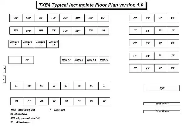 The TXE4 MCU program was stored in EPROM with capacity for 32k 16-bit instructions. Each instruction took 2 microseconds to execute except those accessing Registers which took 6 microseconds. The higher performance enabled the maximum number of registers per MCU to be increased.