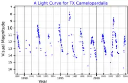 TX Camelopardalis (abbreviated TX Cam) is a Mira-type variable star in the constellation Camelopardalis. It is a classical long period variable star with pulsational period of 558.7 days.[2] Water masers have been observed around the star.[8]