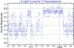 The object was first suspected to be a RW Aurigae-type star in 1949.[18] It was categorized as a T-Tauri star in 1975. In the same year, it was suspected to be variable and the variability was confirmed in 1976.[19] A 1993 paper said that it might be a weak-lined YY Orionis star.[20] T Cha might be either a member of the young ε Chamaeleontis association or the slightly older η Chamaeleontis association.[17][9] T Cha is an Orion variable that fluctuates between 10.05 and 14.5.[3][8]