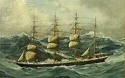 By 1888, when his oldest son Tom Purvis was born, he was living in Bristol.[9] He moved in early 1894 to Cardiff,[9] where he for a time also ran a photographic studio, and was still there in 1902.[10] Soon after, he moved to Blackheath, London. He was in Blackheath when his son Tom started at Camberwell School of Art in ca. 1904. By the outbreak of the First World War, the great sailing ships Purvis loved to paint were in decline. In 1915 he moved to the Far East, leaving his family behind,[11] and took employment as mate or master of various steamships, at least until 1925.[5] Meanwhile, he continued to paint.[12] Purvis died in Hong Kong on 17 January 1933, after an accident.[13]