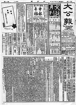 In 1930, Ta Kung Pao was the first press to report the intervention of Zhang Xueliang in the Central Plains War, which led to the defeats of Yan Xishan and Bai Chongxi.[28] After the Mukden Incident of 1931, Ta Kung Pao did not approve for escalation of the war with Japan but rather discussed on how to revenge in the future, aligning itself with Chiang Kai-shek and was therefore criticised by overseas Chinese in Southeast Asia.[24][29] In the Xi'an Incident of 1936, Chiang Kai-shek was detained by Zhang Xueliang and Yang Hucheng, an event that occurred simultaneously with Ta Kung Pao's publication of Chiang's order to dismiss Zhang. The Nationalist government air-dropped tens of thousands of copies of Ta Kung Pao over Xi'an, each bearing an open letter demanding Zhang to release Chiang.[23] In the New Fourth Army incident of 1941, Ta Kung Pao sided with the Nationalist government, criticising the Communist Party for its attack on allied forces.[30] After the Battle of South Shanxi, Ta Kung Pao advocated for cooperation between the Communist Party and the Nationalist government, attributing the failure to the Communists' reluctance to collaborate, prompting Zhou Enlai to pen a letter rebutting the accusations.[27]: 83