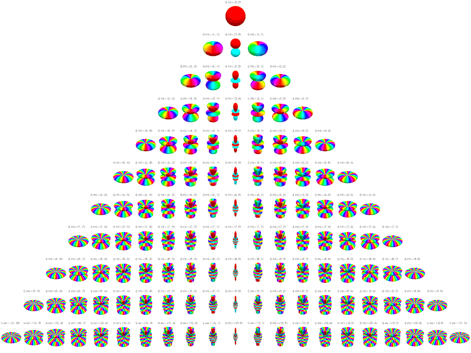 Below the real spherical harmonics are represented on polar plots. The magnitude of the spherical harmonic at particular polar and azimuthal angles is represented by the radius of the plot at that point and the phase is represented by the hue at that point.