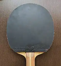 Table tennis rubber is a type of rubber used as covering on a racket in table tennis.[1] Modern table tennis rubber is usually composed of two layers: a layer of foam ("sponge") underneath and a layer of actual rubber on the surface.[2] There are four common types of table tennis rubbers: short pips, long pips, antispin, and inverted.[1] The thickness and density of the sponge layer underneath also affects how the rubber will handle the ball.[3]