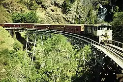The next section climbed the Barron River Gorge reaching 317 m asl using 1 in 50 grades and 4 chain (~88m) radius curves (the tightest used on the system) involving 15 tunnels and several major bridges. The Redlynch section was built with 21 kg/m (42 lb/yd) rails, but in recognition of the high wear the sharp curves would cause, the Gorge section was laid with 30 kg/m (60 lb/yd) rails.[3] This section opened to Myola (16°48′06″S 145°36′41″E / 16.8017°S 145.6113°E) in 1891, and the line reached Mareeba (16°59′34″S 145°25′16″E / 16.9928°S 145.4212°E) in 1893.[2] The Barron Gorge section had cost nearly three times the original estimate, and the government, reluctant to commit to any further public expenditure on extending the Tablelands rail network, sought alternative options.[4]