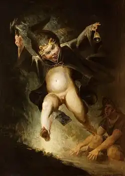 The west side of the first floor is occupied by the gallery, which has been described as "one of the great rooms of Cheshire".[3][4][11] It contains most of the finest furniture from the house. The items include mirrors and marble tops attributed to the London workshops of Thomas Chippendale, and sofas attributed to George Bullock. There is more furniture by Gillow as well as two virginal, brought from the Old Hall: one is a four-and-a-half octave instrument by Phillip Jones from 1761, and the second a three-and-a-half octave instrument from the late 17th century, which is probably Italian. Both are in working order and can still be played.[15] Paintings in the gallery include the Portrait of Sir John Fleming Leicester, 1st Lord de Tabley, in Peer's Robes, started by Joshua Reynolds and completed by James Northcote, and Portrait of Georgiana Maria Lady Leicester by Lawrence. There are more paintings by Northcote and Lawrence, and others by Julius Caesar Ibbetson, William Hilton, Charles Robert Leslie, Francis Cotes, Augustus Wall Callcott, and George Henry Harlow.[4] Two paintings, Friar Puck by Henry Fuseli[16] and The Fall of Phaeton by James Ward, were originally in Sir John Leicester's London Gallery but were sold in 1827. They were bought back at auction by the 2nd Lord de Tabley in the mid-19th-century.[17]