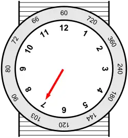To use a tachymeter-equipped watch for measuring speed, the chronograph is started at a starting marker of a known distance.[3] At the next marker, the point on the scale adjacent to the second hand indicates the speed (in distance between markers per hour) of travel between the two. The typical tachymeter scale on a watch converts between the number of seconds it takes for an event to happen and the number of times that event will occur in one hour. The formula used to create this type of tachymeter scale is