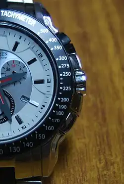 A tachymeter (pronounced /tæˈkɪmətər/) is a scale sometimes inscribed around the rim of an analog watch with a chronograph.[1][2] It can be used to conveniently compute the frequency in inverse-hours of an event of a known second-defined period, such as speed (distance over hours) based on travel time (distance over speed), or measure distance based on speed. The spacings between the marks on the tachymeter dial are therefore proportional to 1⁄t , where t is the elapsed time.