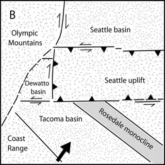 The relationship of the Seattle Uplift with other neighboring blocks, and the nature of the faults between them, is not well known. If tectonic strain is from the south, and therefore perpendicular to the Seattle and Tacoma Faults, the motion on them should be entirely dip-slip (vertical). If tectonic strain is from the south-west (see adjoining diagram), perpendicular to the Rosedale monocline, and also to the Olympia Fault (south-west boundary of the Tacoma Basin) and South Whidbey Island Fault (north-east of the Seattle Basin), both of which are parallel to the Rosedale monocline (and also to the Olympic–Wallowa Lineament, whose significance here is not known), then there should be some component of left-lateral strike-slip motion on parts of the Seattle and Tacoma faults.[6] There has been a suggestion that the position of the Seattle and Tacoma faults may correlated with strain accumulation in the Olympic Mountains (to the west),[7] but this is yet to be worked out.