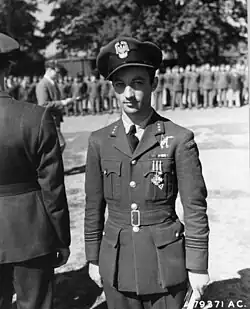 He was then assigned to the 56th Fighter Group, under Polish-American fighter ace Francis Gabreski where he formed a Polish section.[2][3] For his time with the 56th Group, he was awarded the US Air Medal and Distinguished Flying Cross.[2][3] On 14 June 1944, he was given the command of the 3rd Polish Fighter Wing, and on 10 October 1944, became commander of the 131st (Polish) Fighter Wing.[2][3] Soon after taking the command, he was injured in a crash.[2] On 16 July 1945, he returned to duty as the commander of the Polish 3rd Wing. Later he commanded the 133rd Fighter Wing.[2][3]