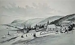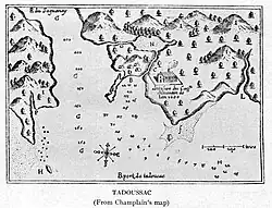 Tadoussac was founded in 1599 by François Gravé Du Pont, a merchant, and Pierre de Chauvin de Tonnetuit, a captain of the French Royal Navy, when they acquired a fur trade monopoly from King Henry IV.[6] Gravé and Chauvin built the settlement on the shore at the mouth of the Saguenay River, at its confluence with the St. Lawrence, to profit from its location. But the frontier was harsh and only five of the initial sixteen settlers survived the first winter.[7] In 1603, the tabagie or "feast" of Tadoussac reunited Gravé with Samuel de Champlain and with the Montagnais, the Algonquins, and the Etchimins." In 1615, the Mission of L'Exaltation-de-la-Sainte-Croix-de-Tadoussac, named in memory of a cross planted by Jean de Quen, was founded by the Récollet Order. Their missionary brothers sang the first Mass there two years later.[1]