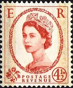 Luminescent tagging has been added to postage stamps of the United Kingdom since the Wilding issues of 1959 in the shape of vertical bands. Stamps of the current Machin series have been printed with one or two such "phosphor bands";[5] those for second-class mail bear only one such band, those for first-class mail bear two. The positions of the bands may vary: stamps from booklets may have shortened, notched, or inset bands that do not extend onto neighbouring gutters to avoid the use of the latter instead of stamps for franking.[6] Due to the presence of optical brighteners in many printing papers, phosphorescent materials were chosen for stamp tagging in the UK.[7]