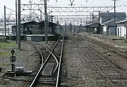 The station consists of a side platform and an island platform, connected to the station building by a level crossing. The station building is unattended.