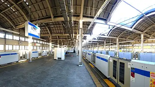 The station is composed of two island platforms serving four tracks. The Mita line sidings are next to the station.