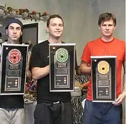 In the public eye, Blink became known for their juvenile antics, including running around nude;[18] the band made a cameo appearance in the similarly bawdy comedy American Pie (1999).[19] While grateful for their success—which the trio parlayed into various business ventures, like Famous Stars and Straps, Atticus Clothing and Macbeth Footwear[20]—they gradually became unhappy with their goofy public image. In one instance, the European arm of UMG had taken photos shot lampooning boy bands and distributed them at face value, making their basis for parody appear thin.[21] In response, a conscious effort was made to make the trio appear more authentic with their next album. However, the relentless pace also was wearing on the group, and the growing divide between art and commerce began to frustrate them. The band was rushed into recording the follow-up, as according to DeLonge, "the president of MCA was penalizing us an obscene amount of money because our record wasn't going to be out in time for them to make their quarterly revenue statements. [...] And we were saying, 'Hey, we can't do this right now, we need to reorganize ourselves and really think about what we want to do and write the best record we can.' They didn't agree with us."[22] To satiate fans in the interim, the band issued a stopgap live album, The Mark, Tom, and Travis Show (The Enema Strikes Back!), displaying more of their high-energy antics, in November 2000.