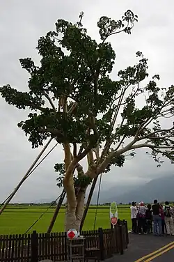 Takeshi Kaneshiro Tree is a bishop wood located on Mr. Brown Avenue, Chihshang Township, Taitung County, Taiwan. Because of advertisements made in June 2013 by EVA Air with Takeshi Kaneshiro in this tree, it was named Takeshi Kaneshiro Tree.[1] Since then, this tree has become a famous landmark attracting countless tourists to visit this place like a pilgrimage. It is estimated that the annual output value of tourism will reach NT$500 million. However, after the increase of tourists, a small number of people littering and destroying of crops by trampling has caused concern by local citizens to the extent that local farmers wanted to cut down the tree.[2][3]