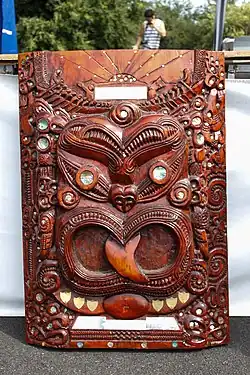 Manu Sutherland's father Henare carved the shield, which stands over one metre tall[6] and signifies the new migration of Māori and the coming together of Māori and Australians.