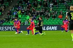 Taking the knee (or taking a knee) is a symbolic gesture against racism whereby an individual kneels upon one knee in place of standing to attention for an anthem or other such occasion. It was originated by American football player Colin Kaepernick on September 1, 2016, in protest against the lack of attention given to the issues of racial inequality and police brutality in the United States. Kaepernick's protest led to a wider series of national anthem protests.[1] It has since been adopted by sports players in countries around the world, including association football in the United Kingdom, in solidarity with Kaepernick's protest against racism, and has been seen worldwide in non-sporting contexts such as the Black Lives Matter protests.[1][2]