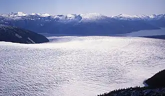Taku Glacier (Lingít: T'aaḵú Ḵwáan Sít'i) is a tidewater glacier located in Taku Inlet in the U.S. state of Alaska, just southeast of the city of Juneau. Recognized as the deepest and thickest alpine temperate glacier known in the world, the Taku Glacier is measured at 4,845 feet (1,477 m) thick.[2] It is about 58 kilometres (36 mi) long, and is largely within the Tongass National Forest.