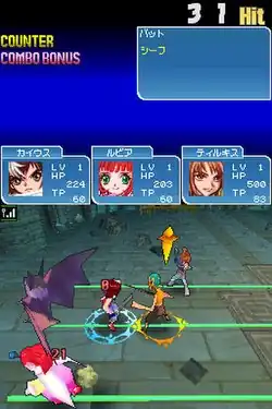 The battle system is a scaled-down version of the Tales series' recurring Linear Motion Battle System (LMBS), a real-time system similar to a fighting game where character actions are performed at the press of a button, with specific buttons triggering either normal or special attacks. The version used in Tempest is called the "3-on-3 LMBS". The player controls one character, with the other two available in battle controlled by the game's artificial intelligence. After setting up a formation in advance, players can switch between characters at will during battle. During battles, characters can switch between three plains of movement, as opposed to previous 2D Tales titles which restricted characters to a single plain. This allows for characters to evade or surround enemies.[2] Actions such as healing, character control and item usage are all controlled using the DS touch screen.[3]