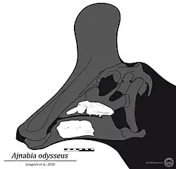 - ^ a b Longrich, Nicholas R.; Suberbiola, Xabier Pereda; Pyron, R. Alexander; Jalil, Nour-Eddine (2021). "The first duckbill dinosaur (Hadrosauridae: Lambeosaurinae) from Africa and the role of oceanic dispersal in dinosaur biogeography". Cretaceous Research. 120: 104678. Bibcode:2021CrRes.12004678L. doi:10.1016/j.cretres.2020.104678. S2CID 228807024.