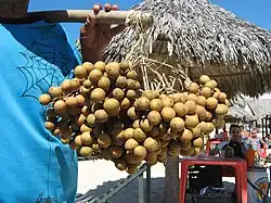 The flowers are produced in a panicle 10–15 cm long, the individual flowers small and white. The fruit is round to ellipsoid in shape, 1.5–4 cm in diameter. Beneath the outer peel is the white, translucent, sweet-sour pulp with one or two large, elongated seeds.