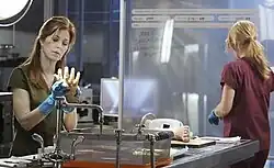 ![]() Megan Hunt (Dana Delany) (left) and Kate Murphy (Jeri Ryan) (right). A TV Fanatic critic praised the autopsy of the dismembered victim, with this particular scene being called "fascinating", putting the critic in "awe", finding herself "compelled to watch the results". | |