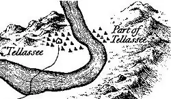 In 1761-62, Henry Timberlake visited the Overhill towns as a British envoy during a peace tour following the Anglo-Cherokee War. He made a map showing a townhouse and 22 dwellings (15 on the east bank and 7 on the west bank) at Tallassee. He also noted on the map that 47 warriors resided at Tallassee— it was the third-smallest contingent of towns he listed and mapped in the valley (Mialoquo and Tanasi had fewer warriors). Timberlake notes also that Tallassee's "governor" had recently died and had yet to be replaced.[4]