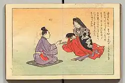 The tamatebako appears in the story of "Urashima Tarō", whose modern version are generally all based on the national textbook.[6] It is told that Urashima Tarō the fisherman was invited to a sea palace (Ryūgū or Dragon Palace) by the princess (Otohime) after saving a turtle.[7][8] He spent a number of days,[b] fed and entertained [c] and upon his leaving received the tamatebako ("treasure box"[9]) with explicit instructions to never open the box. When he returned, his parents had died and he recognized no one. In dismay he forgot the princess's caution. When he opened the tamatebako, a white puff of smoke escaped, and he was transformed into an old, white haired man.[7]