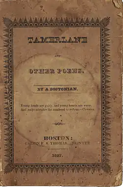 Tamerlane and Other Poems was published anonymously with the credit granted to "a Bostonian".[13] His name, typically listed as "Edgar A. Poe", was not published with his work until his second collection, Al Aaraaf, Tamerlane, and Minor Poems in late 1829.[18] Poe may have chosen not to give his name so that his foster father, John Allan, would not know where he was;[19] moreover, his choice to embrace his Bostonian heritage may have been an attempt to distance himself from the Allan family in Richmond.[20] Boston was, at the time, a center for publishing and the literary world.[6] By the time the book was released, Poe was already in the Army.[21]