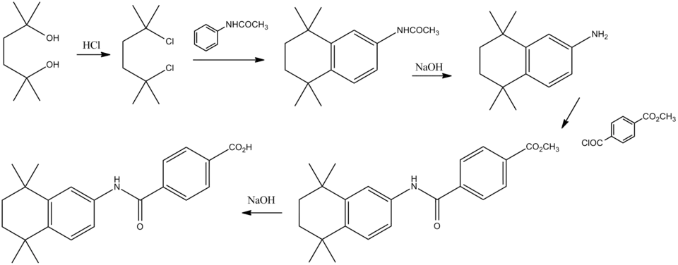 Reaction of the diol (1) with hydrogen chloride affords the corresponding dichloro derivative (2). Aluminum chloride mediated Friedel–Crafts alkylation of acetanilide with the dichloride affords the tetralin (3). Basic hydrolysis leads to the primary amine (4). Acylation of the primary amino group with the half acid chloride half ester from terephthalic acid (5) leads to the amide (6). Basic hydrolysis of the ester grouping then affords (7).[7]